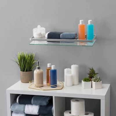 This floating glass shelf with brushed chrome railing is both, a perfect contemporary accent and a functional storage space for your bathroom. The 20-inch-wide tempered glass provides enough space to keep your toiletries within easy reach while the decorative brushed chrome railing keeps them safely in place. Includes all mounting hardware for easy installation.