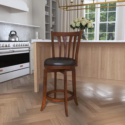 Traditions are important and having pieces in your home that can withstand the test of time as you make new memories is important too. With this wood Counter Stool, find that timeless piece to share meals and smiles with. Crafted with a wooden frame in a cherry finish, the 360-degree swivel seat of this stool has an easy-to-maintain brown faux leather, plus a high back perfect for lounging that features a visually appealing flared-taper design. And with its modern-yet-transitional styling, fitting in is this stool’s specialty. Assembly required.
