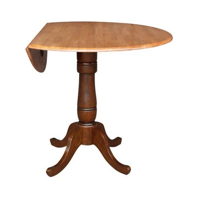 International Concepts home furniture is for those who appreciate high quality, wood furniture with a traditional and elegant look. This piece will beautifully complement your kitchen or dining room. This dual drop leaf dining table is made of solid hardwood with a butcher block top. The table measures 42″W x 42″D. It is available in 3 sizes: dining height – 29. 5″H, counter height – 35. 5″H, and bar height – 41. 5″H. It has a 9″ drop leaf on each side, with a 24″ center piece. The table has a pedestal base with four feet for maximum support. It features a beautiful, dual-toned, cinnamon and espresso finish, and ships ready to assemble.