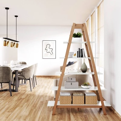 Carlie is a modern multifunctional 5-tier ladder shelf bookcase or display rack with a natural rove brown wood finish and white shelves that has clean lines with an open airy design. The stained rubberwood frame forms two sharp angles that provide structure and strength while displaying your decorations or can even be used as a plant stand.