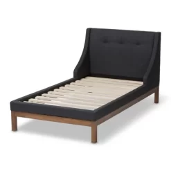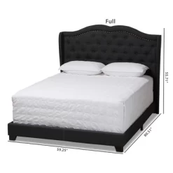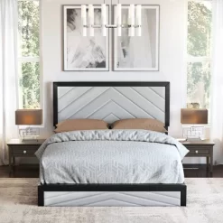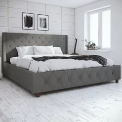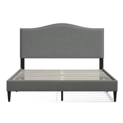 BIKAHOM Upholstered Platform Bed With Square Stitch Headboard, Dark Grey