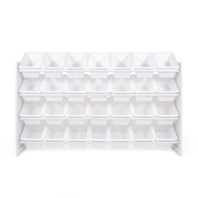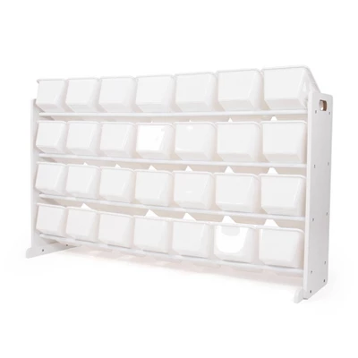 These storage bins are sized just right within the toy organizer for toddlers and preschool aged children but are versatile enough for use by adults as well. This organizer is a great toy storage box alternative and the stylish white colorway makes it the perfect organizational solution for any room in the home. Made with sturdy engineered wood construction frame with stabilizing braces and steel shelving rods, each level can hold up to 30 pounds. Some assembly is required and all hardware is included.