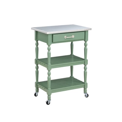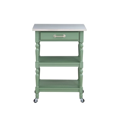 Full of character, the Carolina Kitchen Cart with Stainless Steel Top fills your home with cottage charm. Crafted from rubberwood, this cart features elegant turned legs and a rich Equestrian Green finish. The stainless steel countertop promises easy clean-up, whether you’re using the cart as a food prep station or using the surface to mix drinks for guests. Locking caster wheels add convenience to the design, so you can easily roll it from the kitchen to the dining room or living room when hosting. A drawer keeps utensils and bar tools hidden from sight, while two open shelves offer excellent storage. Furnish your dining room in the same farmhouse style with the 6-Piece Carolina Dining Set (sold separately).
