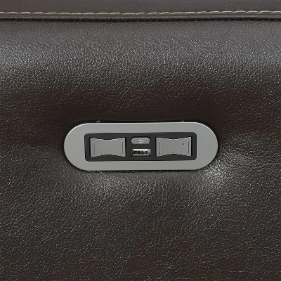 Coachella presents a sophisticated take on motion upholstery in a fashion-forward contemporary styling package. The Coachella Power Recliner Loveseat features dark brown top-grain leather on all seating surfaces, power leg rest and power articulating headrest for comfort and style. The convenient power control contains a USB port and home button to return seat and headrest to original position. Styling features include vertical channel-backs and upholstered beveled leg rests that lend flair while also providing additional support.