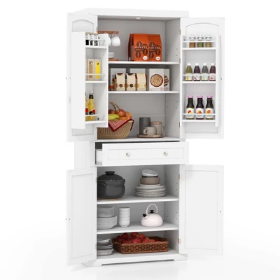 - Maximum Storage Space: This 72” pantry cabinet provides ample space to store food, small appliances or other kitchen items. It has 6 compartments in the main cabinet and 3 door shelves in each of the two upper doors. More, there is a large drawer for frequently used dishes.