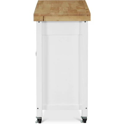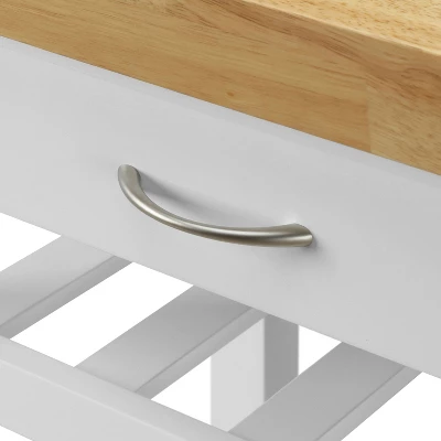 This versatile rolling cart is a great addition to any kitchen. It allows you to easily transport your dishes and utensils where you need them. Stunning yet simple with is cheery white storage shelves and butcher block table top, for a look that brightens up any room. Straight legs and clean lines add a timeless look that fits with any kitchen or dining room decor style.