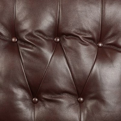 - Chocolate brown genuine leather upholstery on seats, arms, and inside back. Faux leather is on back and sides.