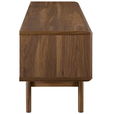Elevate your entertainment decor with the Envision 44″ TV Stand. Featuring an elegant linear silhouette, Envision comes designed with a sliding white door for concealed and open storage space, height adjustable shelves on either side for your game system, DVD or Blu-ray player, and walnut grain veneer over durable fiberboard for reliable support. Supported by flared and tapered legs, update your living room decor while keeping your visual space clean with this versatile TV stand. Accommodates flat screen TVs up to 47 inches.