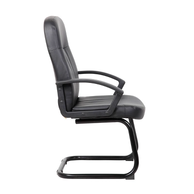 This executive leather budget guest chair provides maximum comfort and an ergonomic configuration with proper lumbar support. Perfect for any office, it features a stable cantilever base and black LeatherPlus upholstery, which is a combination of leather and polyurethane that adds even more comfort and durability. Its practical design and 33 pound weight make it very easy to clean and reposition, so you won’t have to worry about disassembling. It pairs perfectly with our B8106 executive chair.