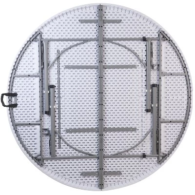 Plan your next wedding, baby shower, quinceañera and catering event around this spacious 71″ round bi-fold granite white plastic banquet and event folding table. Place decorated banquet tables in your event hall to display options to potential clients or these portable folding tables can be brought to the party location. The table folds in half and includes a carrying handle to better grip the table during transport. If you regularly entertain in your home this easy to clean plastic table comes in handy to seat an additional 10 people. Pull out this 6 foot folding table to host game night, craft parties and holiday celebrations. This temporary foldable table has gray powder coated legs that lock underneath the top for flat storage in the garage or storage closet. This ready to use commercial grade folding table is ideal in banquet halls, convention halls, recreation centers, schools and meeting event spaces. Perfect to entertain on for outdoor events the table must be stored indoors to protect the frame from extreme moisture. Additional Features: Folds in half for storage and travel, Includes convenient carrying handle, Gray Powder Coated Locking Legs with protective floor caps, Folded Size: 4″W x 70.75″D x 35.5″H