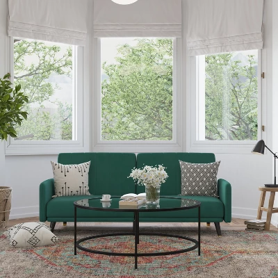 Bring elegance and sophistication into your home with the vintage silhouette of this mid-century modern split back futon sofa featuring soft velvet upholstery with vertical stitching. Compact and multi-functional, the split back design allows each side to be independently adjusted from upright, to reclining, and finally laying flat. If you missed the angle you wanted, simply pull the back completely forward and lay flat to start again. Generously padded, this convertible futon sofa will cradle your body and relieve pressure points while you sit or sleep. Sturdily built with solid wood legs, a wooden frame, and center support legs, this futon sofa holds up to 600 lbs. static weight capacity. Sinuous springs in the seat give an extra supportive feel while the fixed back and seat cushions keep your space neat and tidy. Expertly packaged in 1 box, this sleeper couch arrives with the tools and illustrated instructions included for 10 minute or less assembly and cleanup is easily achieved with a damp cloth.