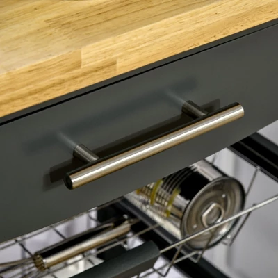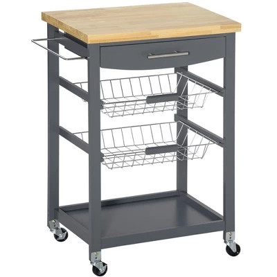This small kitchen cart is an ideal option for your home parties. A handy drawer, two steel pulling baskets, an open bottom shelf, and a towel rack provide ample space for supplies and accessories. Easy-roll wheels allow you to move wherever it is needed most. A two-tone palette naturally is suitable for most home furnishings. Enjoy hosting dinner parties and not be stuck going back into the kitchen with this HOMCOM kitchen island cart.