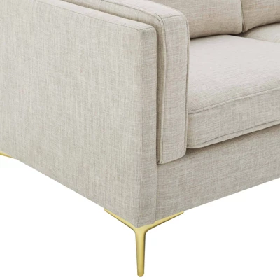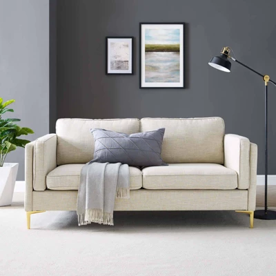 Invigorate your living space with rich tactiles and retro modern charm with the Kaiya Fabric Sofa. Putting a contemporary twist on a classic mid-century modern design, this living room sofa features subtle French piping detail, a tailored profile, and gold metal accents. Covered in soft polyester fabric, this upholstered sofa is padded with dense foam and complete with a sinuous spring support system to offer a premium seating experience. Resting on gold metal legs with non-marking foot pins, this fabric sofa features a solid wood construction for lasting durability. Assembly required. Sofa Weight Capacity: 900 lbs.