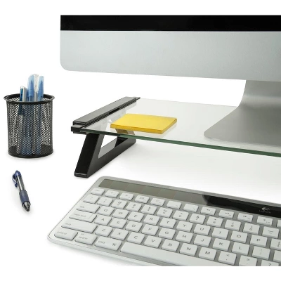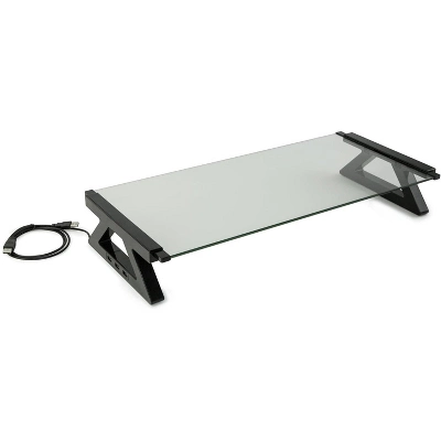The MI-7240 is a glass vented monitor stand that will securely hold a flat-screen monitor or laptop while opening up some valuable desk space. Raise your monitor up to create a more ergonomic viewing position. The tempered glass design will look contemporary in any space, while the integrated USB 2.0 ports will keep your devices charged up and ready to go.