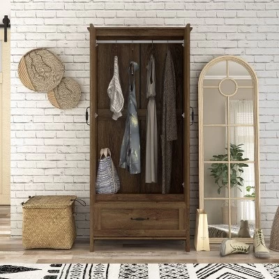 This distressed walnut wardrobe is a great addition for any room that requires more storage spaces whether it’s in the entryway, the bedroom or even the family room. Its framed doors, streamlined drawer and elegant black finish metal handles will give you a transitional style that fits to any decor. It features – storage spaces separated by 2-doors. On the top side there is a metal rod for hanging longer item of clothing.