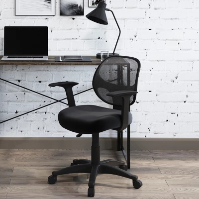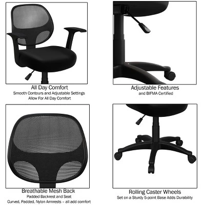 Designed for all day comfort, the Curved Back Office Chair by Lavish Home is sure to give you a better seating experience at home, the office, in study, or as a gamer chair. Constructed with a nylon 5-point base equipped with swiveling nylon casters for maximum maneuverability, a curve-shaped breathable mesh back, lumbar support, a foam cushioned seat, adjustable shelf style arms, and a pneumatic gas lift that allows the seat to adjust from 16-18.5-inches from the floor, this ergonomic chair offers all day comfort. The rolling desk chair is easy to assemble and has a weight capacity of 250-pounds for versatile use at work, in a craft room, study room, or in a home office.