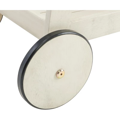 Designed for the modern host, this contemporary indoor outdoor bar cart makes entertaining a breeze. Styled in a clean white finish, its eucalyptus wood construction makes it perfect for transporting cocktails and canapes from the kitchen to any outdoor oasis. Care Instructions: Store outdoor furniture indoors or cover well when not in use. Remove wooden furniture from standing water. Dust regularly with small brush or vacuum. Spills should be taken care of immediately before they harden or stain with a slightly dampened sponge. Do not use bleach solutions.