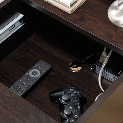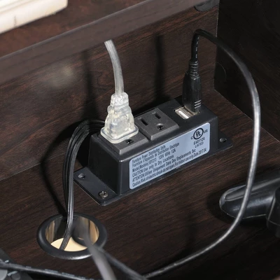 - Sliding top reveals charging station with power strip for mobile electronics storage