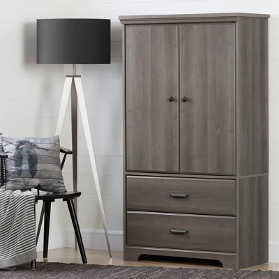 Storing clothing and accessories just got more stylish with the Versa 2-Door Armoire with Drawers from South Shore. With two drawers on the bottom and four shelves, you’ll find enough room for sweaters, jeans, T-shirts and all your accessories in this wardrobe armoire. Use as storage for your everyday items or as a place to organize and pack away off-season clothing when it’s not in use.