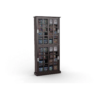 With Atlantic’s Windowpane 720 CD & DVD Media Storage Cabinet, you can get rid of your random assortment of mismatched CD towers, DVD and Blu-Rays disc storage racks, and other multi-media storage units in exchange for one elegant cabinet. Espresso-finished MDF and wood composite construction. Tempered glass “windowpane” two-way sliding door fronts. Accommodates 720 CDs, 288 DVDs (or wii games) + 144 CDs, or 348 Blu-Rays (or PSP games) + 144 CDs. There is a two tier (upper and lower) arrangement with 8 adjustable height shelves. Wall anchor and extra-wide base for added support and additional stability.