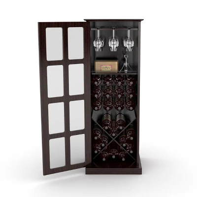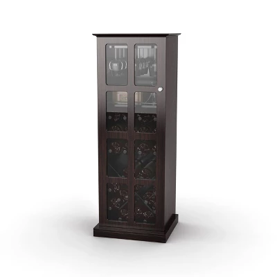The X design crossed wood panels for odd and over sized wine bottle storage, suspended steel-rod wine storage rack for upside down win glass storage and wine accessory storage shelf with steel-rod retaining wire. Espresso finished composite wood construction with tempered glass “Windowpane” style swinging door mounted on easy-glide hinges with brushed metal door handle. Extra wide base for added support.